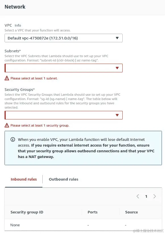 如前面的屏幕截图所示,我们选择了默认 VPC。我们需要配置其他组件,如子网和安全组,这是必需的。子网是 VPC 中的 IP 地址范围。对于需要互联网访问的任何资源,应使用公共子网。私有子网用于不需要连接到互联网的任何资源。