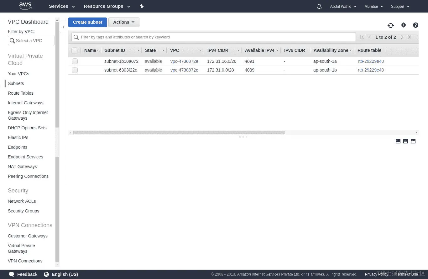 AWS VPC 是一个隔离的网络,因此在 VPC 网络内运行的任何服务都无法访问公共互联网。如果需要为任何资源访问公共互联网,则必须至少有两个子网。在 VPC 仪表板中使用以下设置: