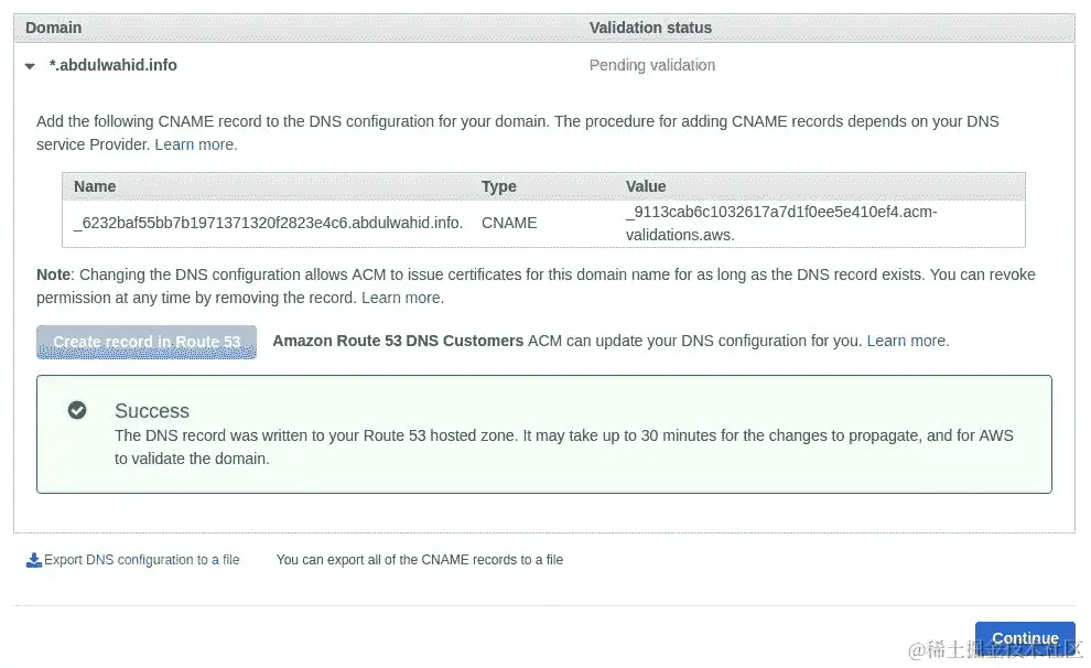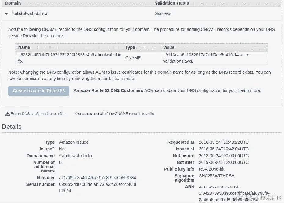 - 点击“创建”按钮后,它会自动使用给定的 CNAME 记录更新 Route 53 中的 DNS 配置。您将看到成功消息,如下面的截图所示: