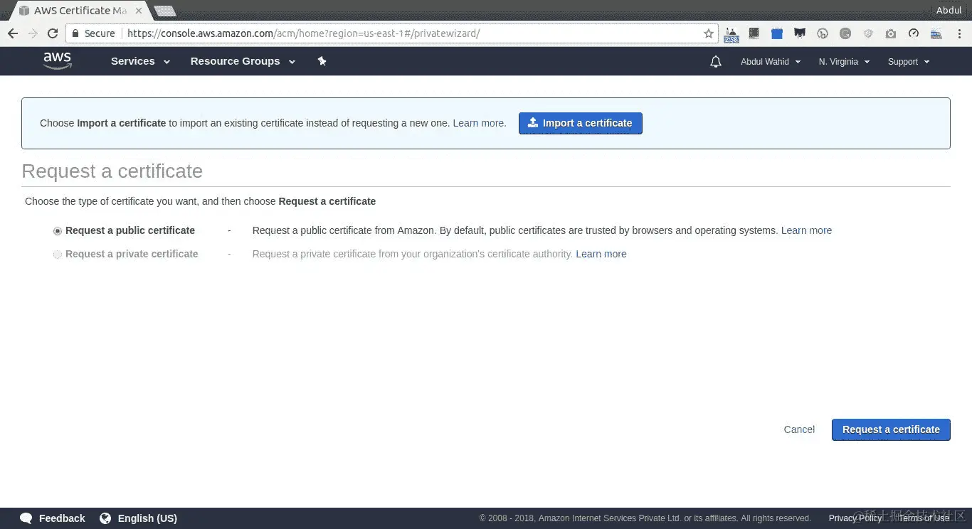 如果您是 AWS ACM 的新用户,请在“Provision certificates”下点击“Get Started”,如果您已经在使用 AWS ACM,请选择“Request a certificate”,如下面的截图所示: