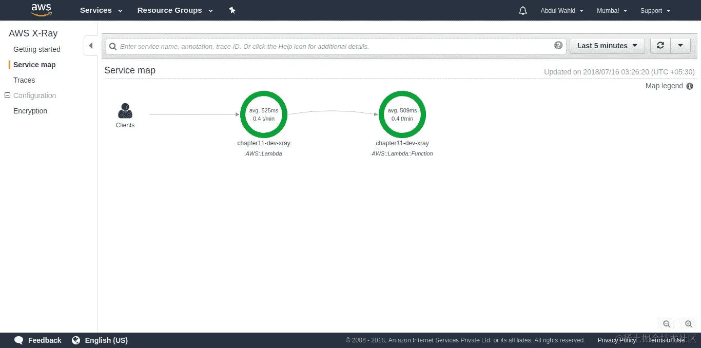 我们已经集成了 AWS X-Ray,因此我们应用程序的所有交互将被 AWS X-Ray 记录为跟踪段。以下是 AWS X-Ray 服务地图的截图: