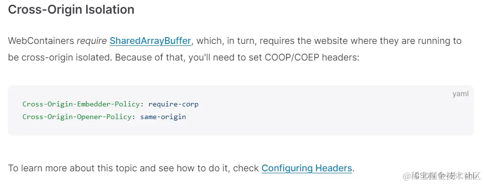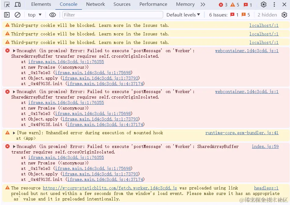 正常是要报错的,WebContainers需要SharedArray Buffer,而这反过来又要求它们运行的网站是跨源隔离的。