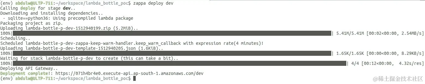 现在,是时候使用zappa deploy <stage_name>命令执行部署过程了。最初,我们将使用zappa deploy命令。一旦我们的应用程序部署完成,我们就不能再使用**zappa deploy**命令了。相反,我们需要使用zappa update <stage_name>命令。
