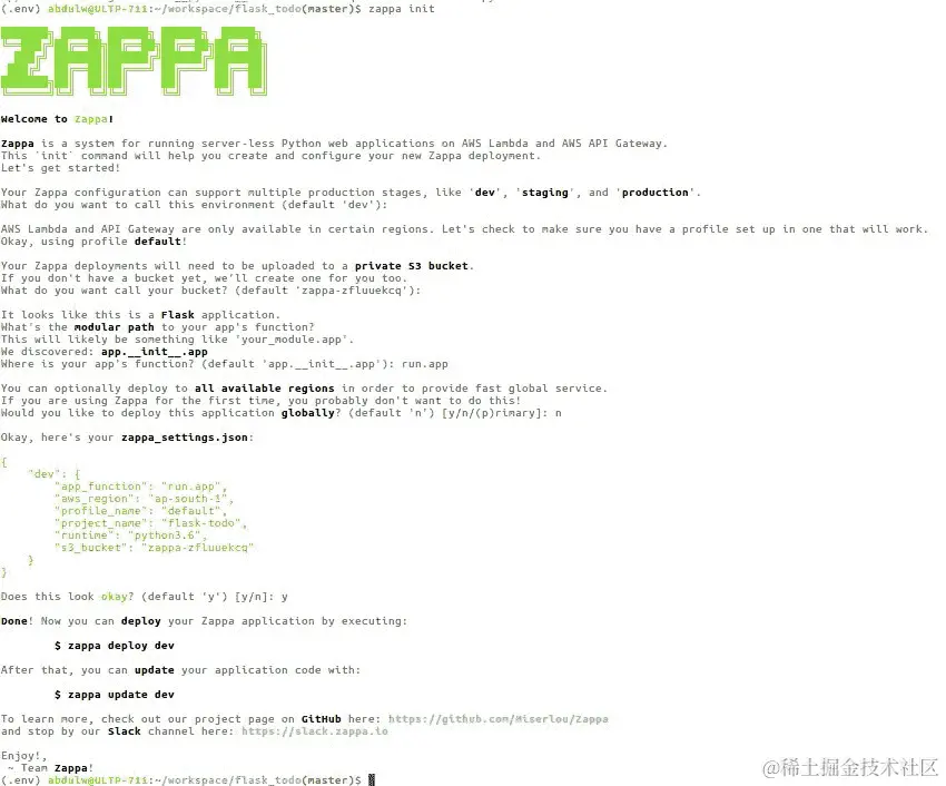 当我们运行zappa init命令时,Zappa 会自动识别框架类型并建议所需的参数。在我们的情况下,我们将app_function名称保持为run.app,因为我们是通过run.py中的create_app方法初始化flask app对象。
