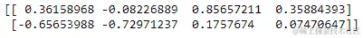 请思考刚才发生了什么。我们实际上创建了一个 PCA 模型,将 4 个维度降低到2,它通过选择 2 个 4D 向量来实现这一点,以创建超平面,将 4D 数据投影到 2 维。你实际上可以通过打印 PCA 的实际成分来看到这些 4D 向量,即特征向量。所以,PCA代表主成分分析,这些主成分就是我们选择来定义平面的特征向量: