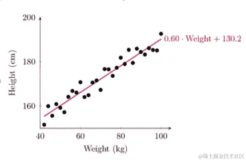 因此,线性回归是将一条直线拟合到一组观察结果中。例如,假设我测量了一群人,我测量的两个特征是他们的体重和身高: