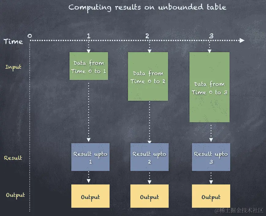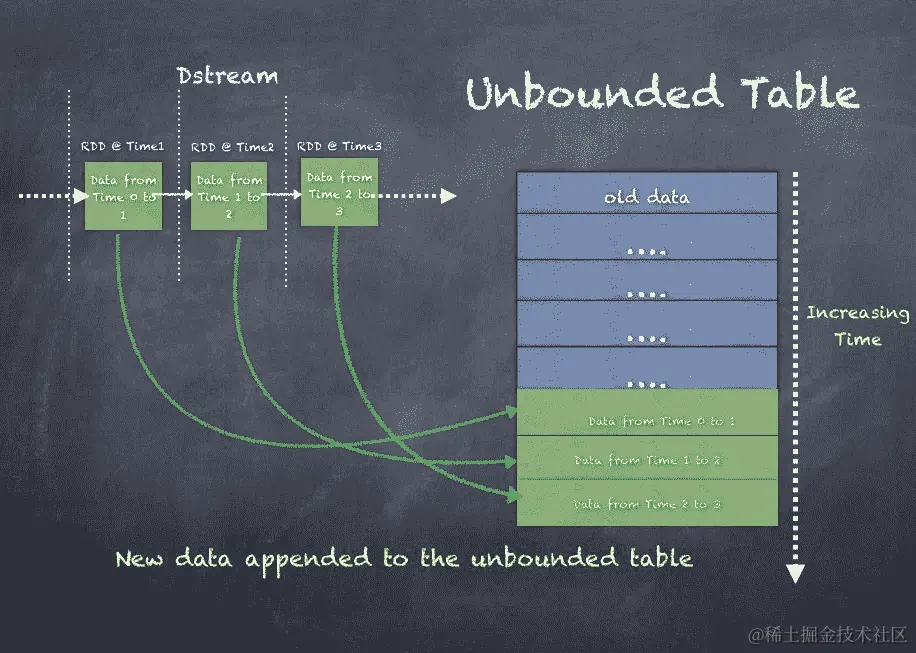 结构化流的关键思想是将实时数据流视为不断追加到的无界表,随着事件从流中处理,可以运行计算和 SQL 查询。例如,Spark SQL 查询将处理无界表: