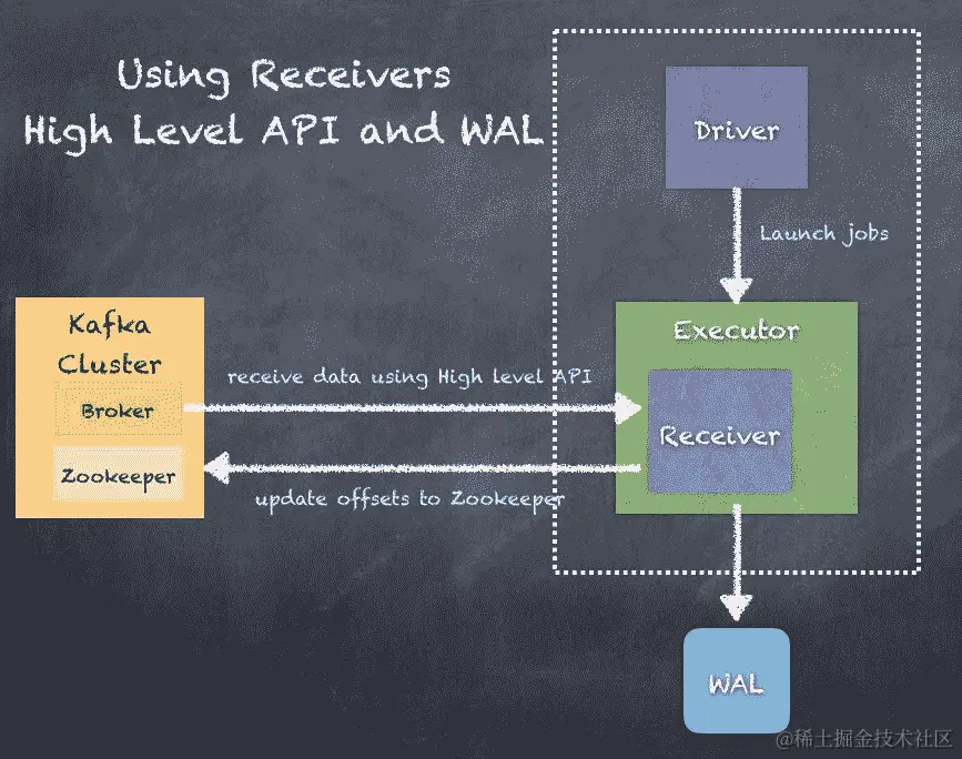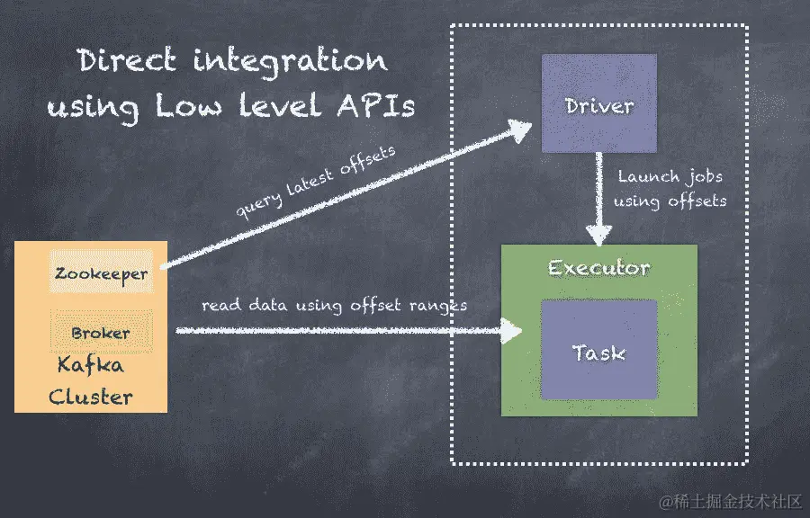 以下是驱动程序如何从 Zookeeper 中拉取偏移量信息,并指示执行程序根据驱动程序指定的偏移量范围启动任务从代理中拉取事件的示例: