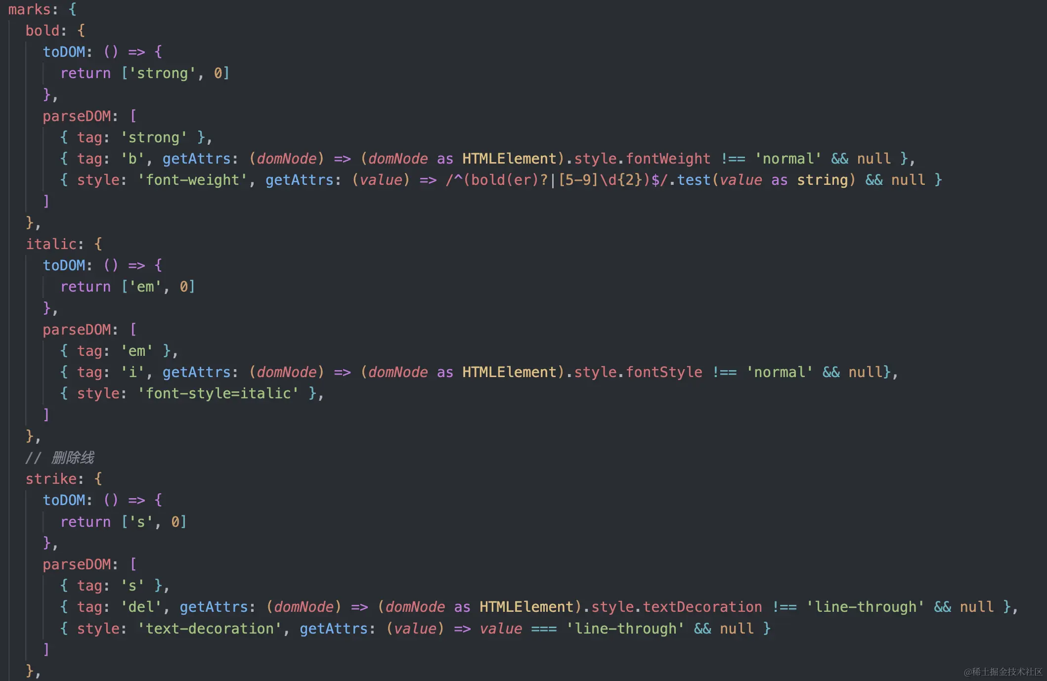 mark:mark是schema用来描述样式,只对node上进行样式装饰,如加粗、颜色、字体、字号等等。