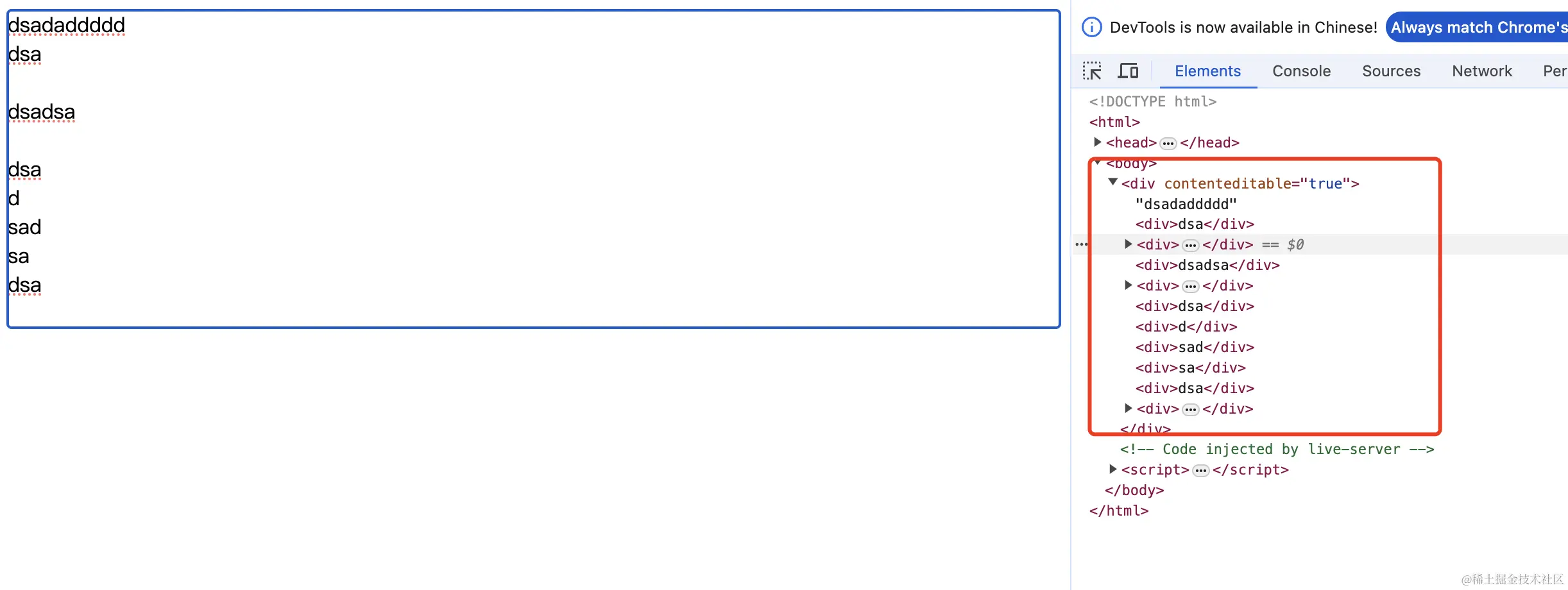 在div中配置了 contenteditable 后输入内容就会生成dom