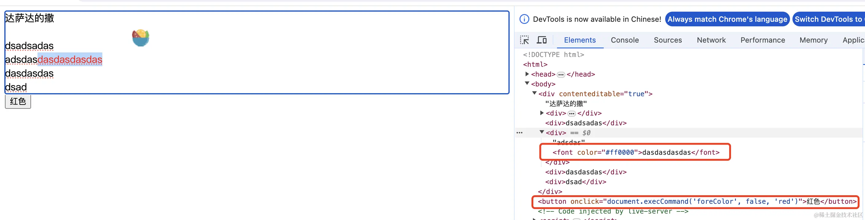 然后可以通过 document.execCommand 来给内容添加样式,比如给一段选中文本添加红色。(不过这个方法已经被mdn废弃)
