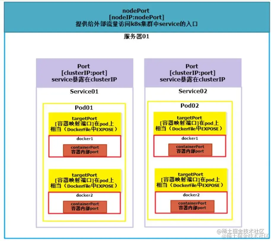 targetPort是Pod的端口,从Port和NodePort来的流量经过kube-proxy流入到后端Pod的targetPort上,最后进入容器。 - containerPort: