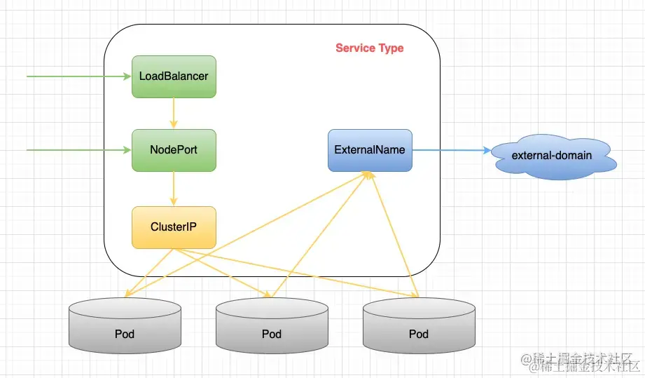 K8s中Service分为四类,分别是ClusterIP,NodePort,LoadBalancer以及ExternalName。下面一张图描述了他们之间的关系以及服务类型: