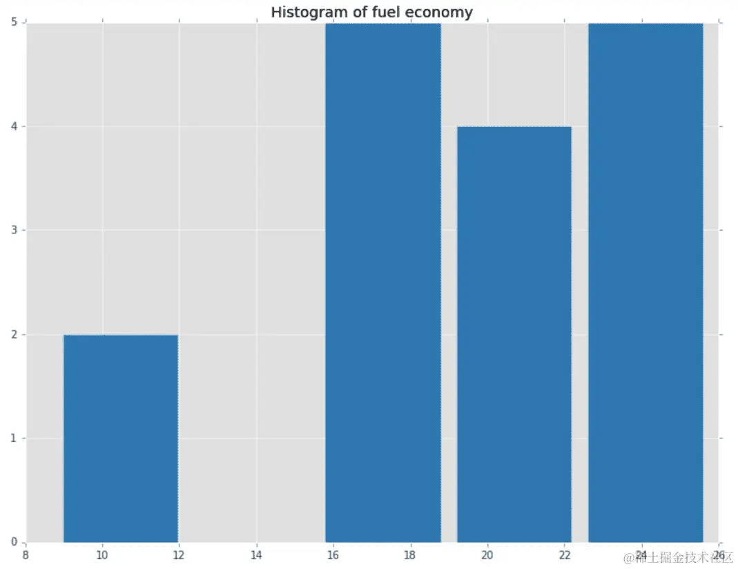 该方法返回两个元素的元组:第一个元素是一个 bin 边界的列表,另一个元素是相应 bin 中元素的计数。这是我们的燃油经济特征的样子: