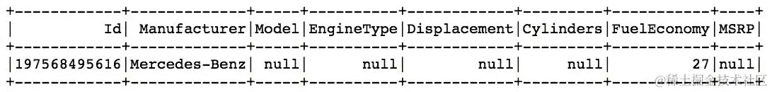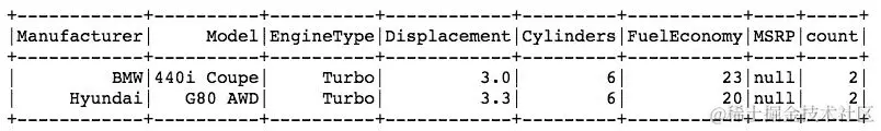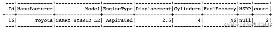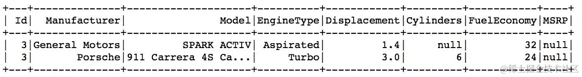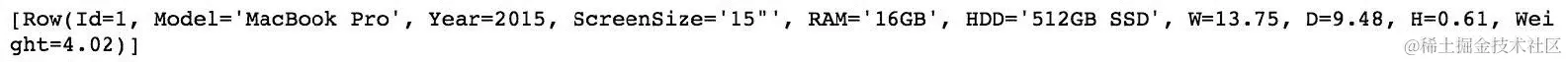 要比较 DataFrame 的内容,我们可以运行sample_data_df.take(1)来获取以下内容: