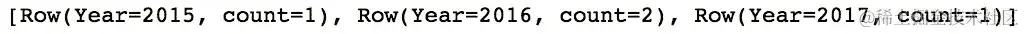 现在您可以看到,DataFrame 是Row(...)对象的集合。Row(...)对象由命名的数据组成,与 RDD 不同。