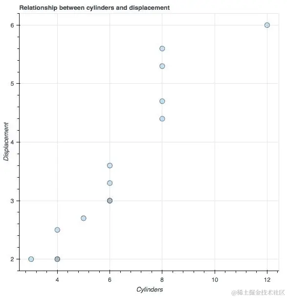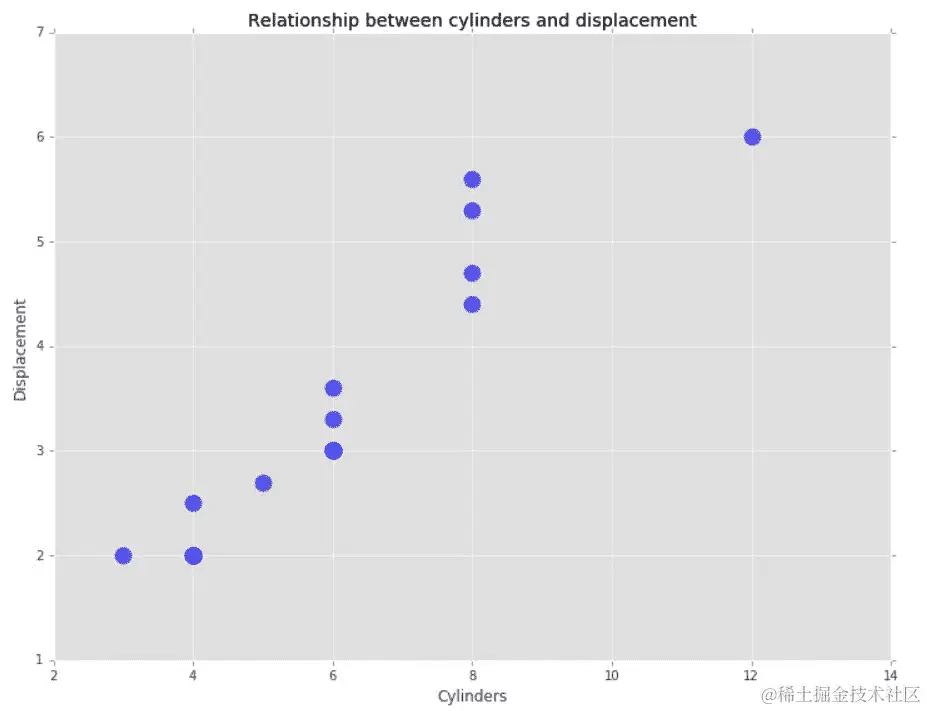 接下来,我们创建一个图形并向其添加一个子图。然后,我们使用我们的数据绘制散点图;x轴将代表汽缸数,y轴将代表排量。最后,我们设置轴标签和图表标题。