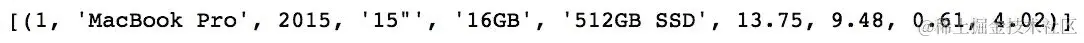 (1, 'MacBook Pro', 2015, '15"', '16GB', '512GB SSD'