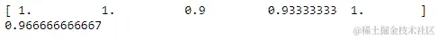 然后我们继续构建一个 SVC 模型,用于预测鸢尾花的种类,只使用训练数据。我们使用线性核来拟合这个 SVC 模型,只使用训练的特征数据和训练的种类数据,也就是目标数据。我们将该模型称为clf。然后,我们在clf上调用score()函数,只是为了衡量它在我们的测试数据集上的表现。因此,我们将这个模型与我们为鸢尾花测量保留的测试数据集以及测试鸢尾花种类进行比分,看看它的表现如何: