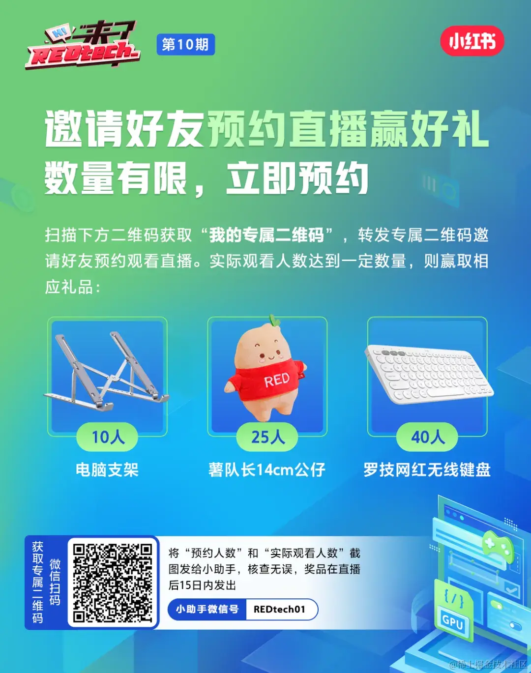 收看直播:微信预约并观看直播,罗技无线键盘、薯队长公仔、电脑支架等精美礼品等你来拿!