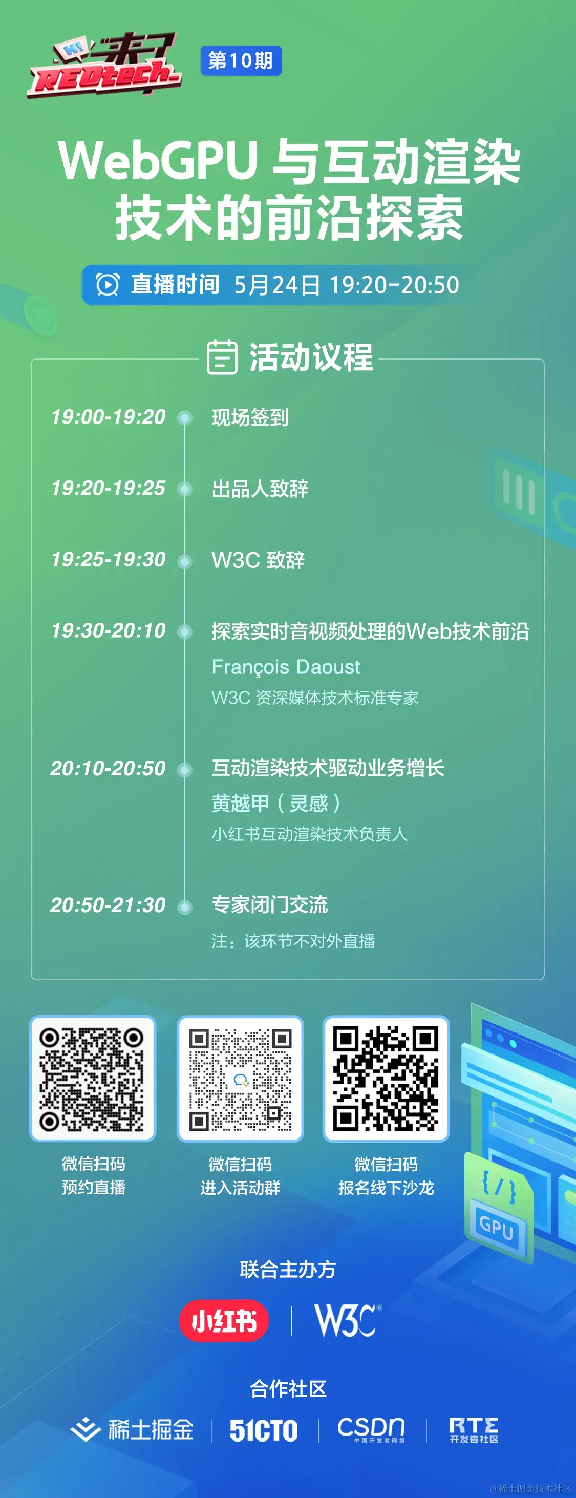 第十期【REDtech 来了】由 小红书前端架构负责人王康(瑞金) 担任出品人,活动将围绕 WebGPU 与 互动渲染技术展开,重点聚焦 GPU 在 Web 标准化领域的应用,互动渲染技术在小红书 App 场景内的应用。与会者将在此分享互动渲染技术的最新动态,探讨技术趋势,并深入发掘如何利用机器学习与 GPU 加速技术来推动 Web 标准化进程,进而赋能产业发展。