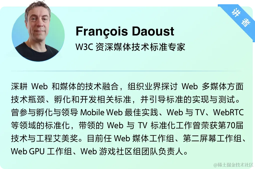 我们特别邀请到了 W3C 资深媒体技术标准专家 François Daoust 与万维网联盟团队成员、小红书互动渲染技术负责人黄越甲(灵感)带来 WebGPU 领域的前沿讲座。