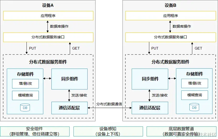 底层通信组件完成设备发现和认证,会通知上层应用程序(包括分布式数据服务)设备上线。收到设备上线的消息后分布式数据服务可以在两个设备之间建立加密的数据传输通道,利用该通道在两个设备之间进行数据同步。