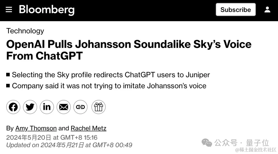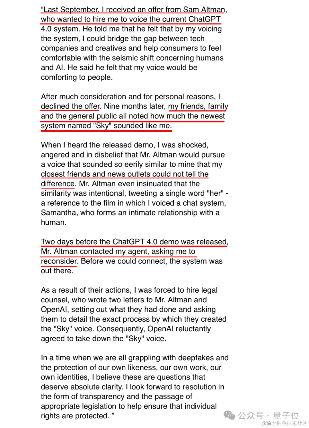 而至于斯嘉丽提到的被奥特曼找到过,还在 GPT-4o 发布之前与自己联系的事情,OpenAI 并未做出回应;针对 OpenAI 介绍的选角流程,斯嘉丽这边也还没有评论。