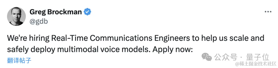 推文中,Brockman 写到,OpenAI 正在招募工程师扩大并安全推进多模态语音模型。
