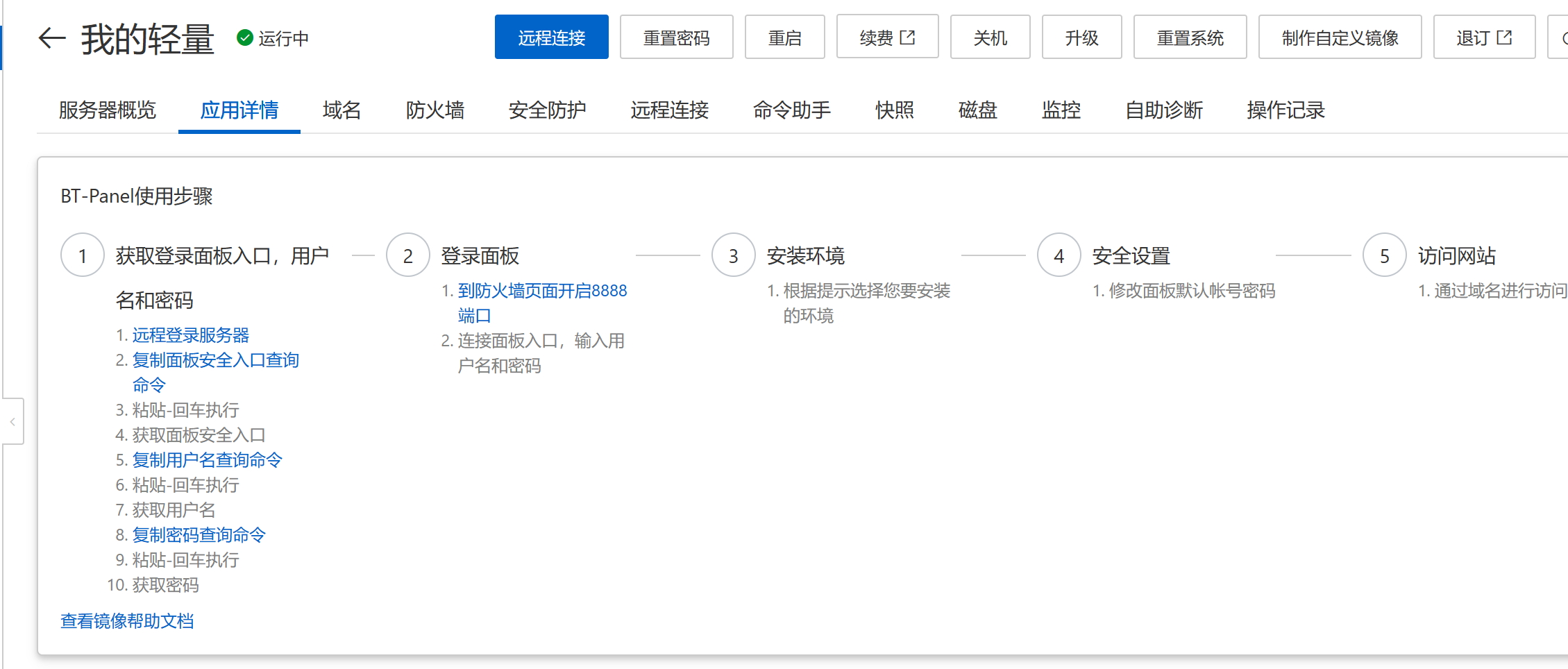 - 在云服务器中得到的面板网址、username、password一定要保存,就只存在一次。如果未保存后期忘记了,只能重置服务器的系统,重新开始安装宝塔Linux