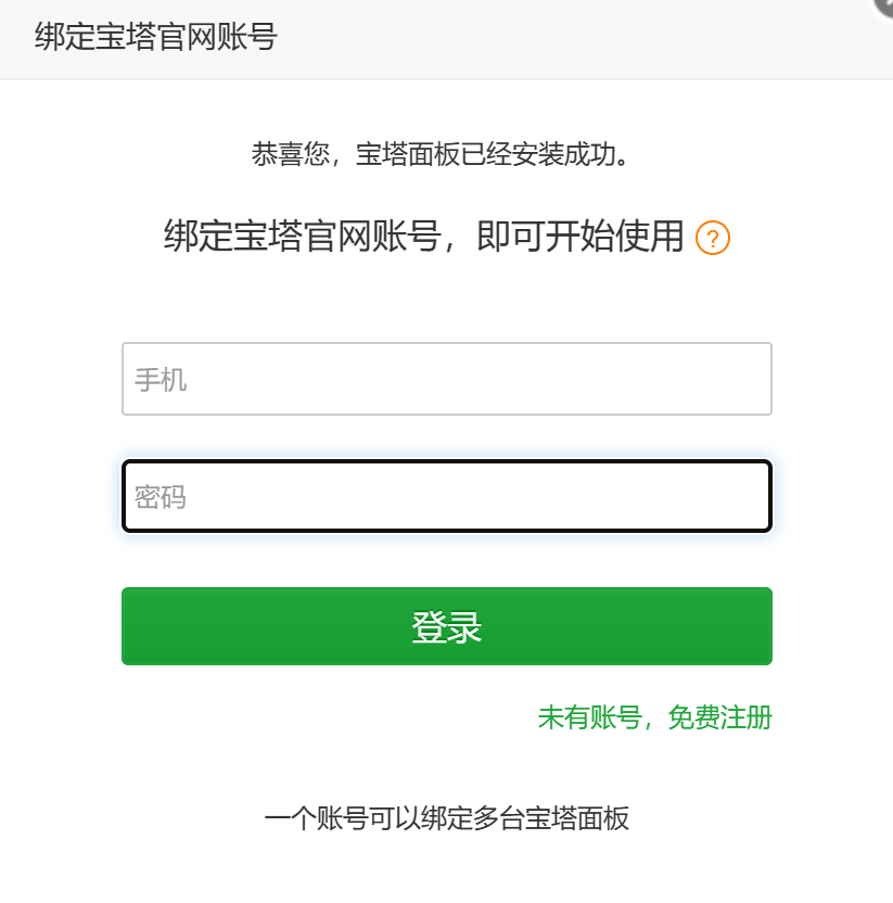 - 绑定手机号。进入到宝塔面板里面后提示绑定手机号,绑定一下。
