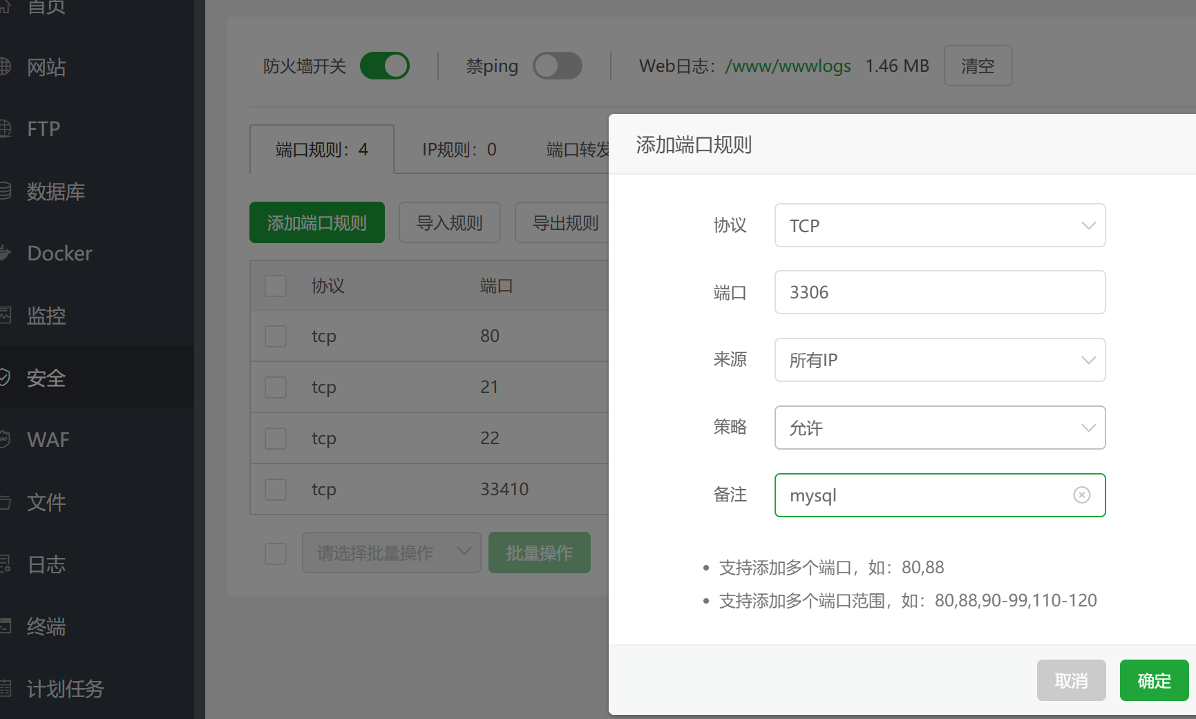 - 放行端口。开放端口是也可以限制IP地址,只能让自己能访问到,怎么知道自己本机的IP地址呢?百度搜索ip,在防火墙,添加规则,点击启用。