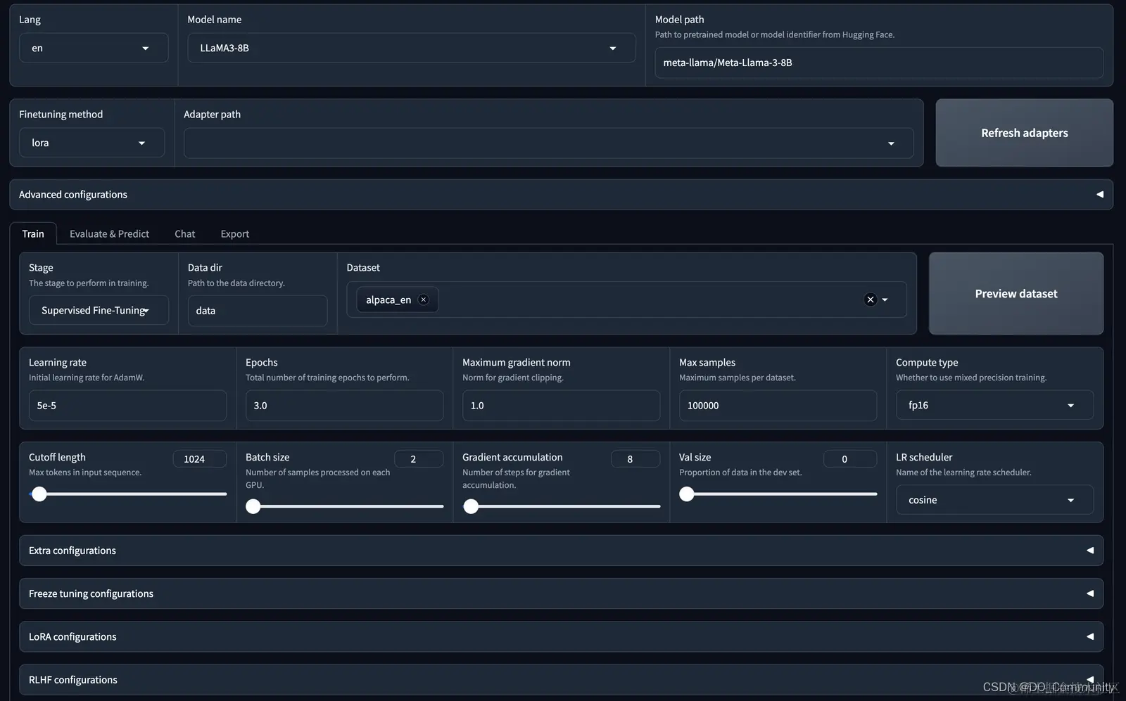- 可用的适配器包括LoRa、QLoRa、freeze或full。