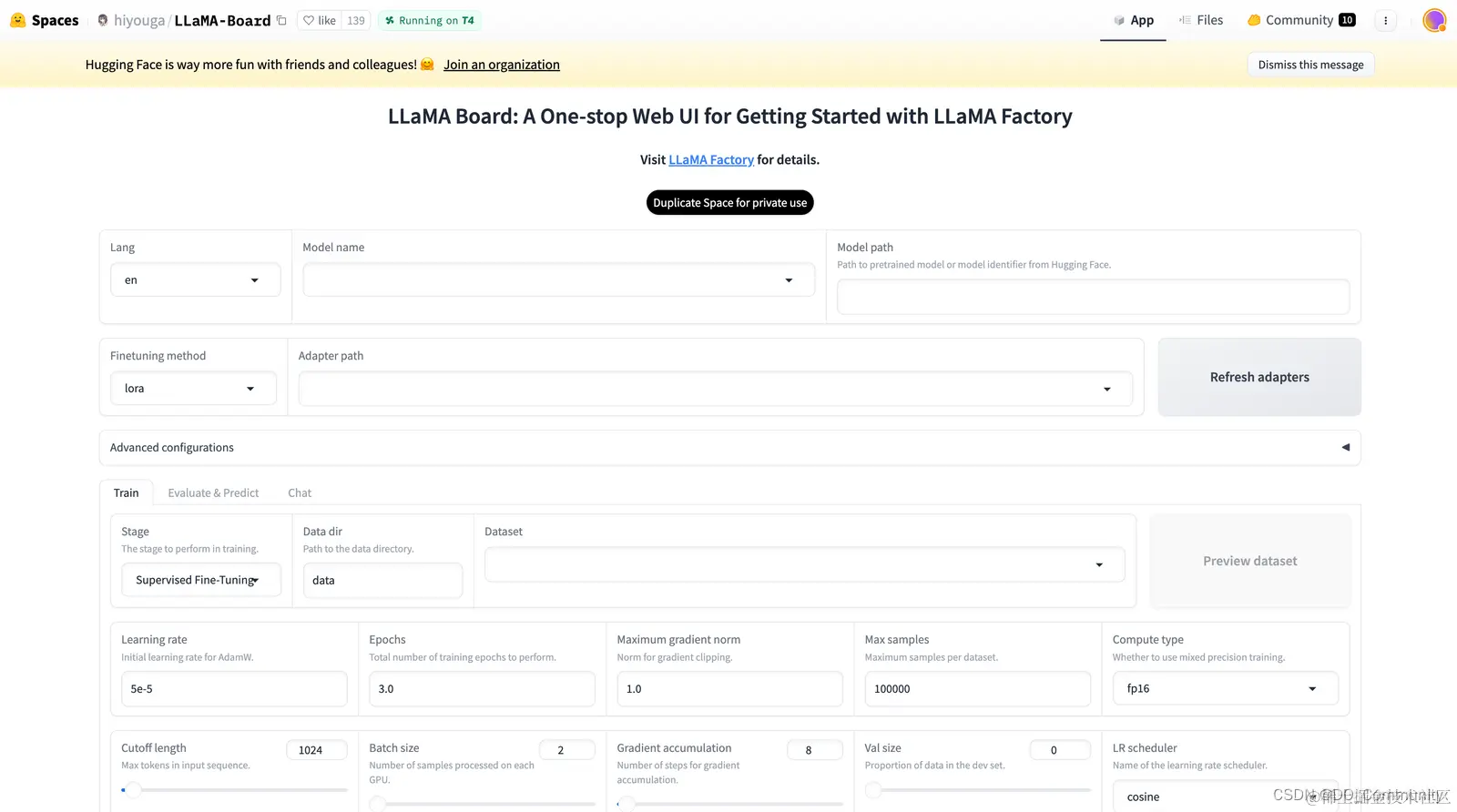 这个空间还支持 Lora 和 GaLore 配置,以减少 GPU 的使用。用户可以通过简单的滑块轻松更改参数,如 dropout、epochs、批次大小等。同时,也有多个数据集选项可供选择以微调你的模型。正如本文所述,LLama Factory支持许多模型,包括不同版本的 LLama、mistral 和 Falcon。它还支持像 galore、badm 和 Lora 这样的高级算法,提供诸如flash attention、位置编码和缩放等各种功能。