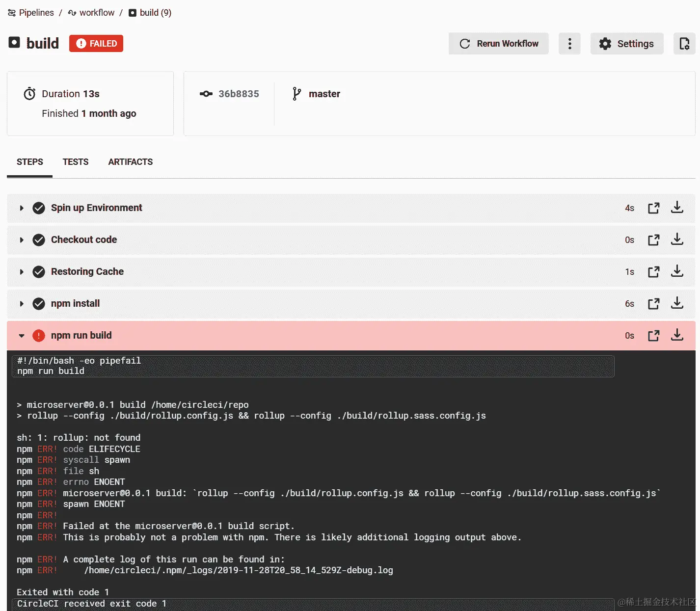 一旦我们这样做,CircleCI 将启动一个构建。如果我们在 CircleCI 中的项目目录中,我们将看到它正在构建。如果我们点击作业,我们将看到它运行我们所有的步骤-我们甚至会看到它运行我们在文件中列出的步骤。在这里,我们将看到我们的构建失败!
