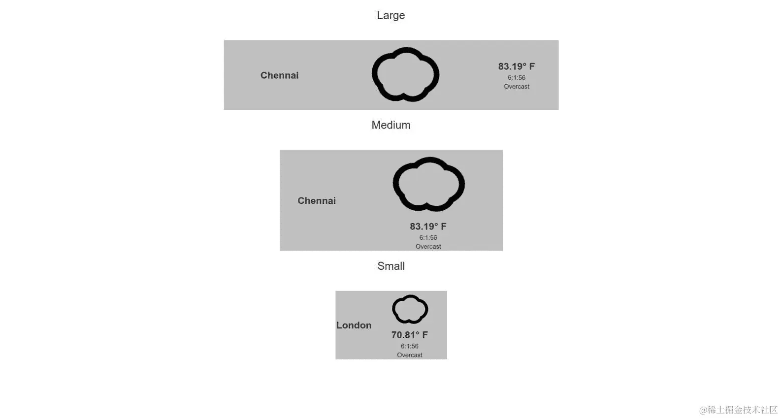 最后,在终端中执行npm run watch来启动 Webpack 开发服务器。你的项目将在http://localhost:8080/上运行(项目 URL 将在终端中打印出来)。目前,Web 应用将显示三个文本:大、中、小。它有三个不同大小的容器,将容纳天气小部件。项目结束时,天气小部件将如下所示:
