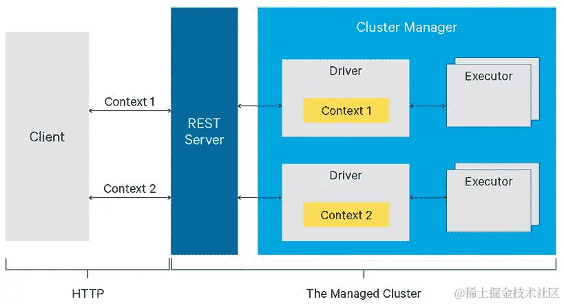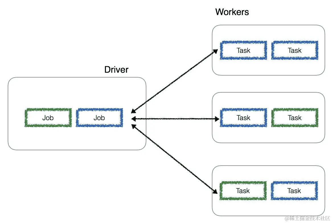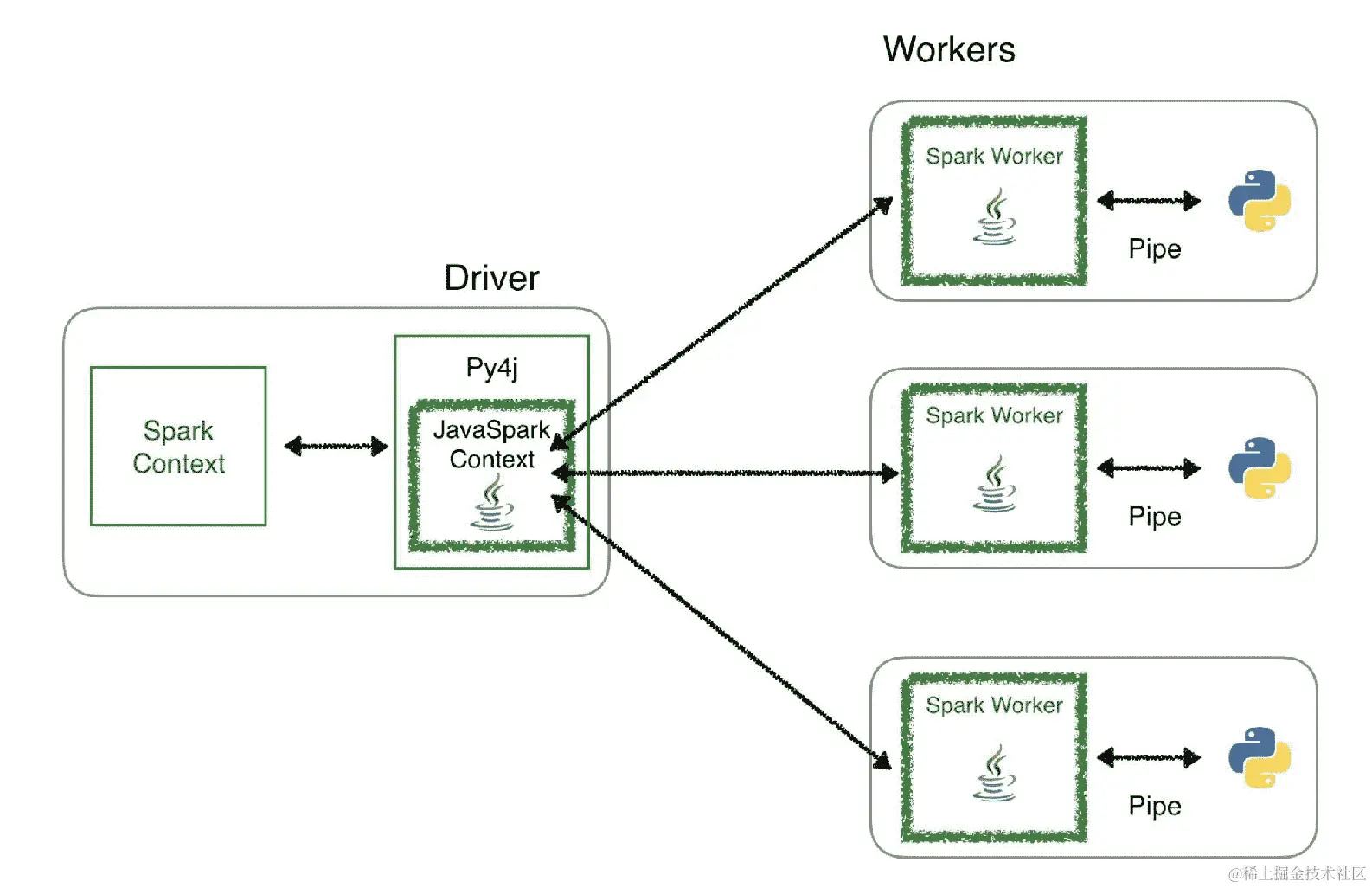 虽然这种方法允许 PySpark 将数据处理分布到多个 Python subprocesses上的多个工作节点,但正如您所看到的,Python 和 JVM 之间存在大量的上下文切换和通信开销。