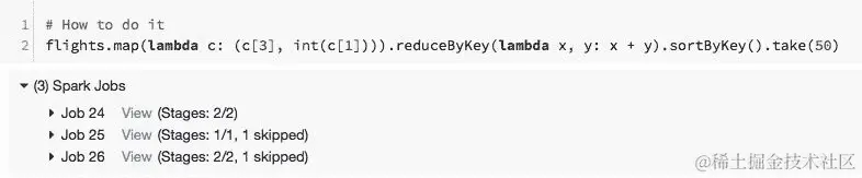 为了更好地了解以前的 RDD 和 DataFrame 的性能,让我们返回到 Spark UI。首先,当我们运行flights RDD 查询时,将执行三个单独的作业,如在以下截图中在 Databricks Community Edition 中可以看到的那样: