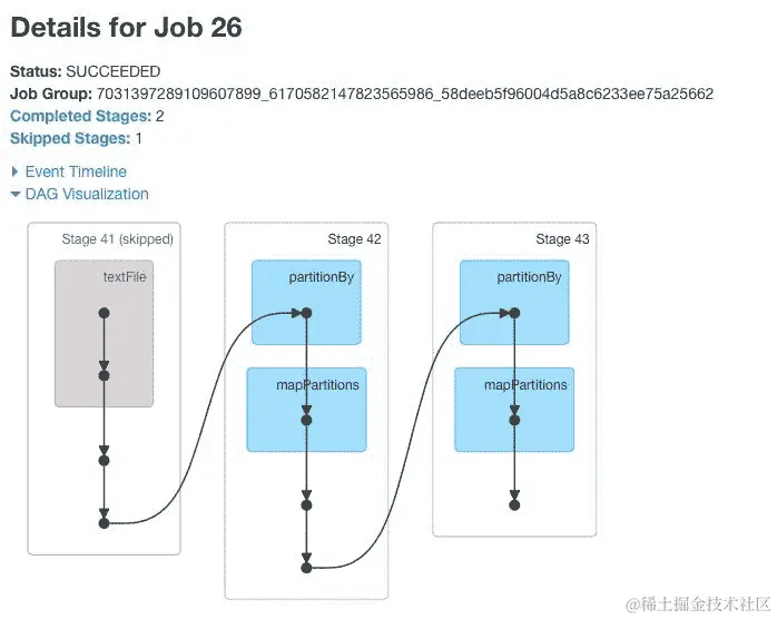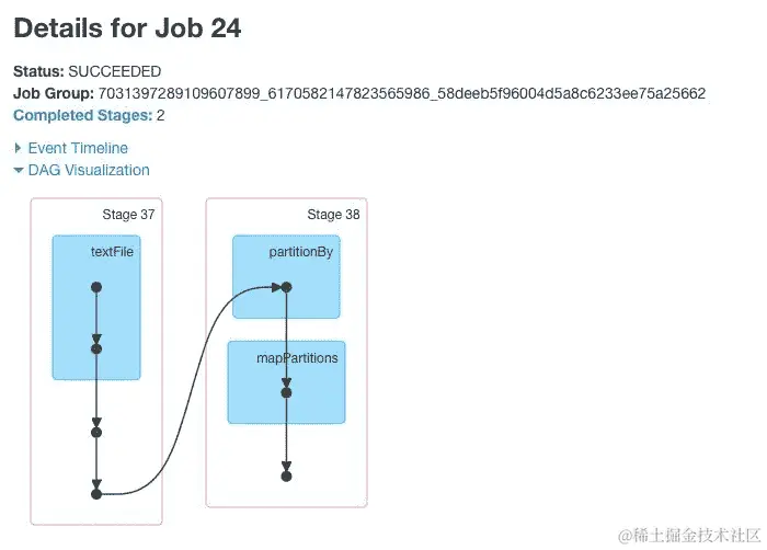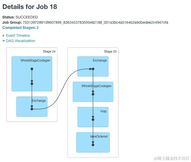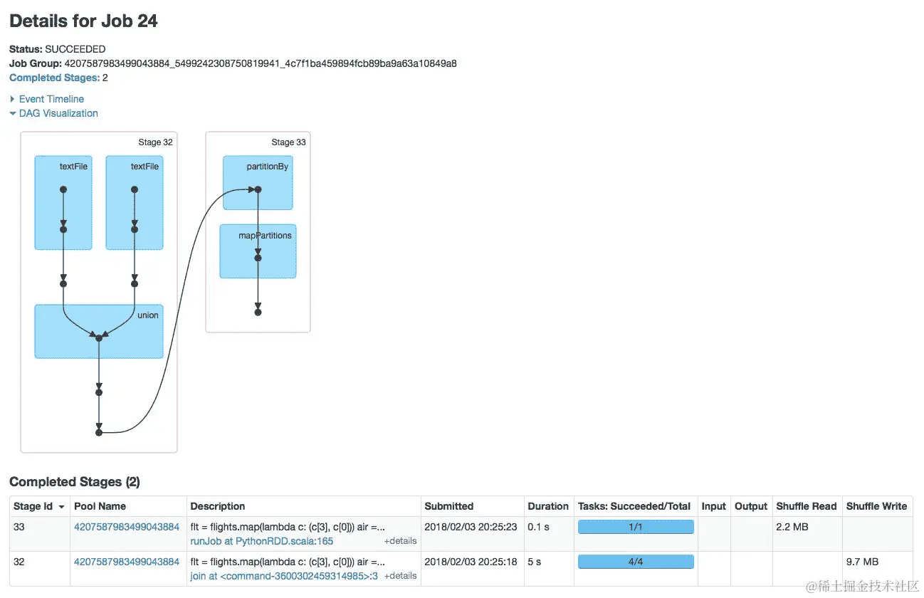 每个作业都会生成自己的一组阶段,最初读取文本(或 CSV)文件,执行reduceByKey(),并执行sortByKey()函数: