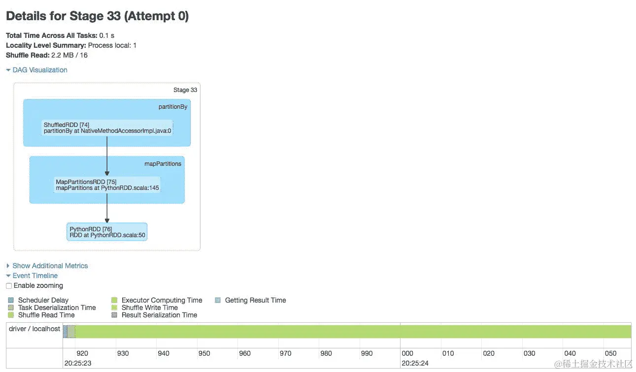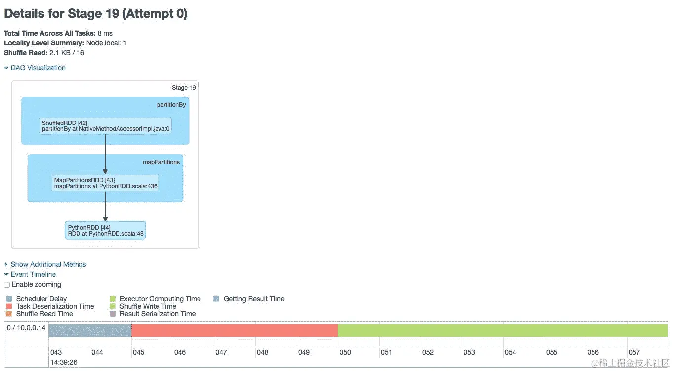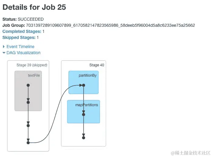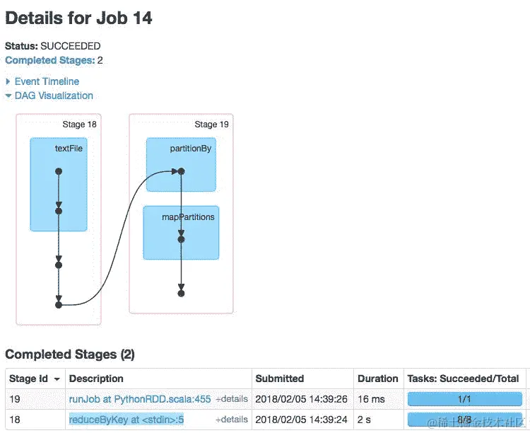 reduceByKey(f)假设f函数是可交换和可结合的,以便可以正确地并行计算。如 Spark UI 中所示,所有八个任务都在并行处理数据提取(sc.textFile)和reduceByKey(),提供更快的性能。 -