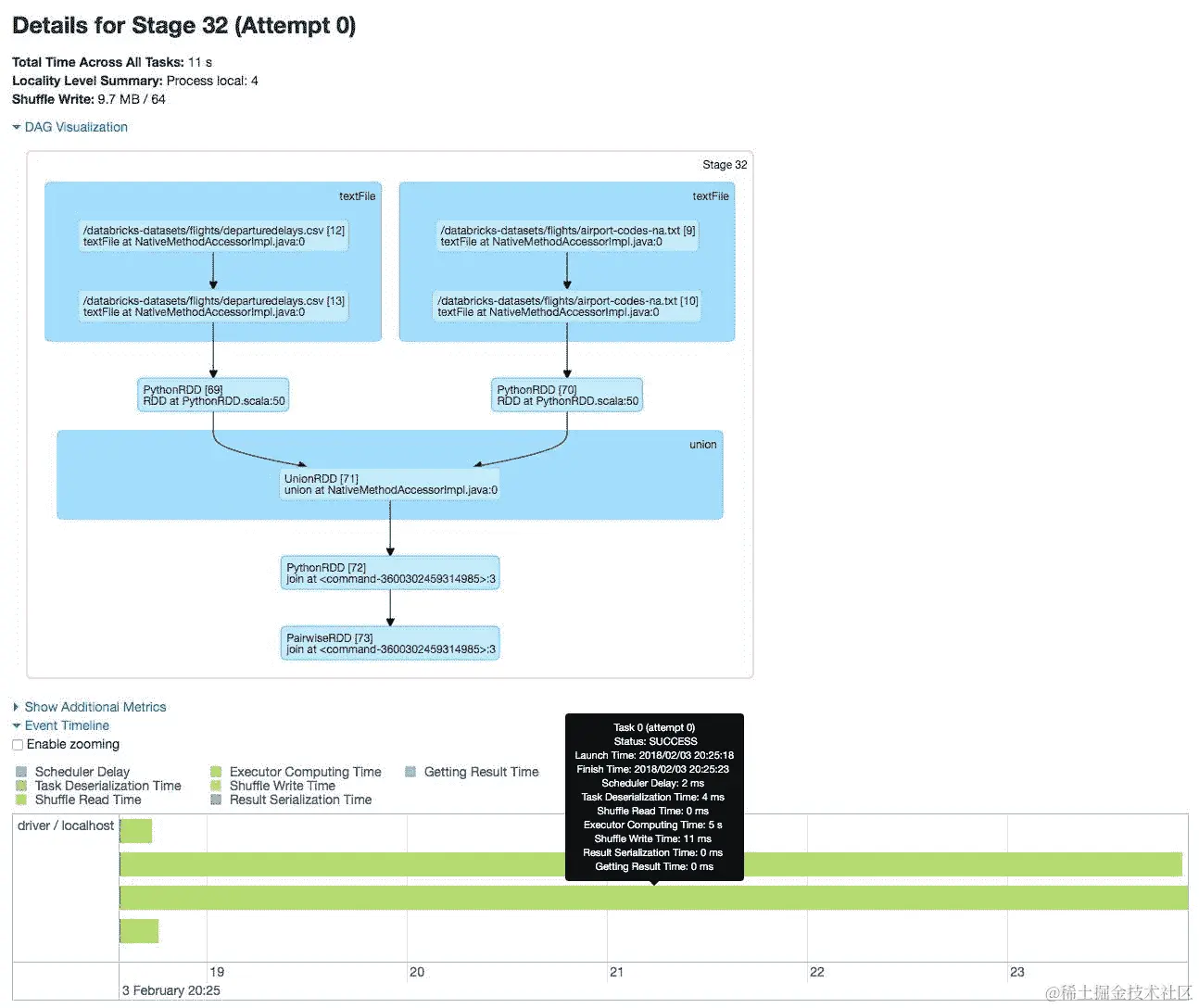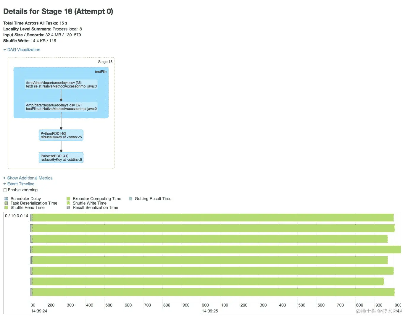 进一步深入研究构成每个阶段的任务,注意到大部分工作是在Stage 18中完成的。注意到有八个并行任务最终处理数据,从文件(/tmp/data/departuredelays.csv)中提取数据到并行执行reduceByKey():