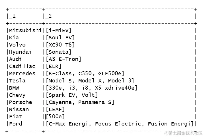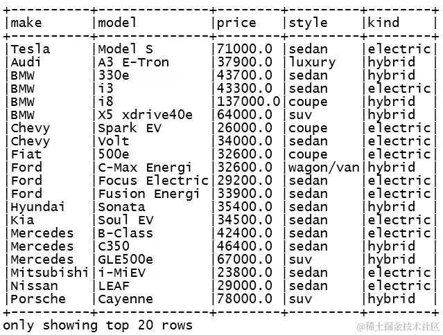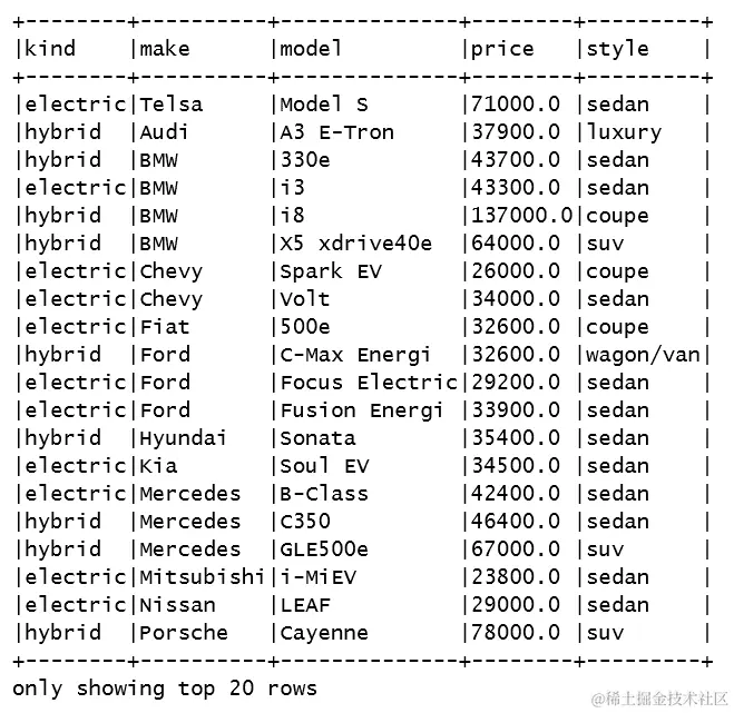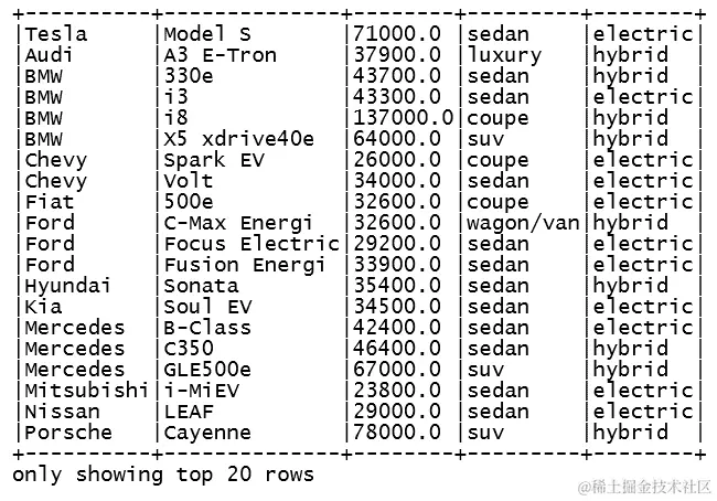 - 最后,我们执行一个 Spark SQL 查询,过滤数据集以获取电动汽车,并仅返回三个已定义的列。