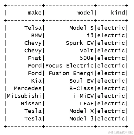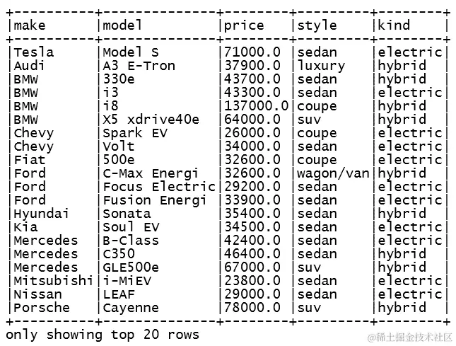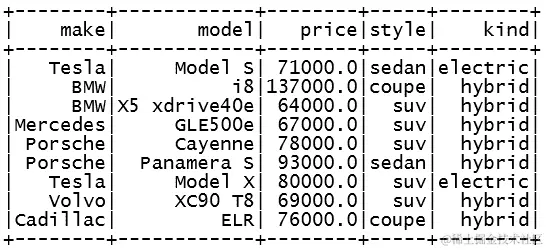 spark.sql("select make, model, kind from cars where kind = 'electric'").show()