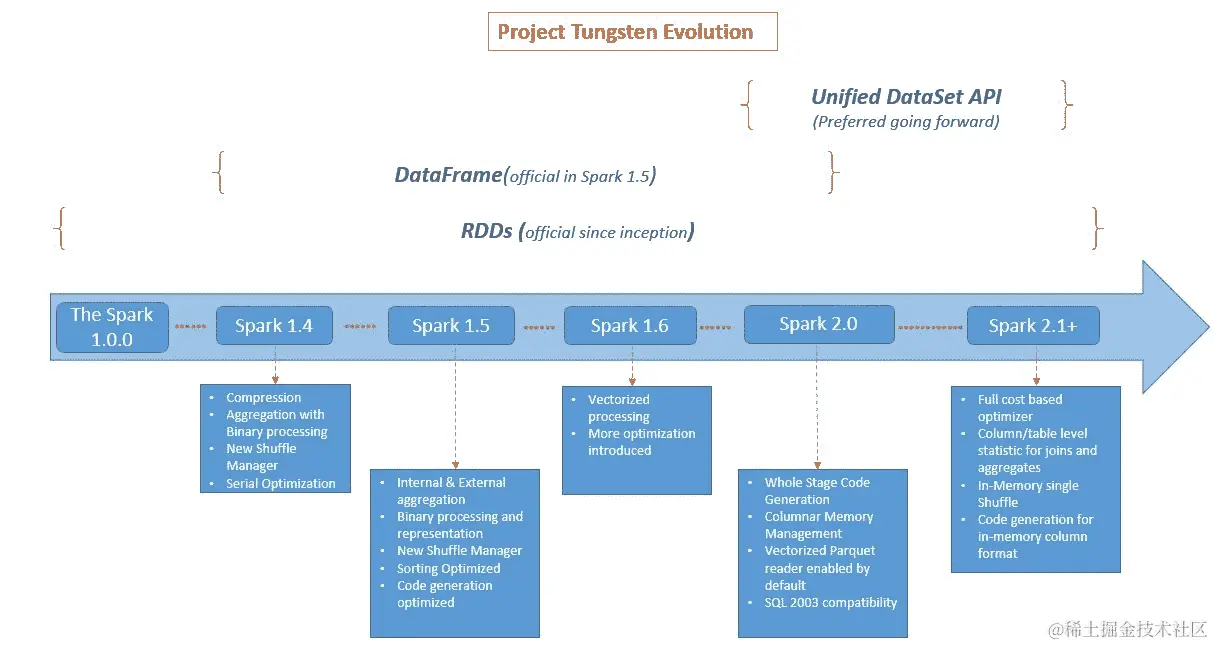 sun.misc.Unsafe接口)。编码器便于将 JVM 对象映射到表格格式(见下图)。如果您使用数据集 API,Spark 将 JVM 对象映射到内部 Tungsten 堆外二进制格式,这更加高效。虽然 Tungsten 内部的细节超出了机器学习食谱的范围,但值得一提的是,基准测试显示使用堆外内存管理与 JVM 对象相比有显著改进。值得一提的是,在 Spark 中可用之前,堆外内存管理的概念在 Apache Flink 中一直是内在的。Spark 开发人员意识到了 Tungsten 项目的重要性,自 Spark 1.4、1.5 和 1.6 以来,一直到 Spark 2.0+的当前状态。再次强调,尽管在撰写本文时 DataFrame 将得到支持,并且已经详细介绍过(大多数生产系统仍然是 Spark 2.0 之前的版本),我们鼓励您开始思考数据集范式。下图显示了 RDD、DataFrame 和 DataSet 与 Tungsten 项目的演进路线之间的关系: