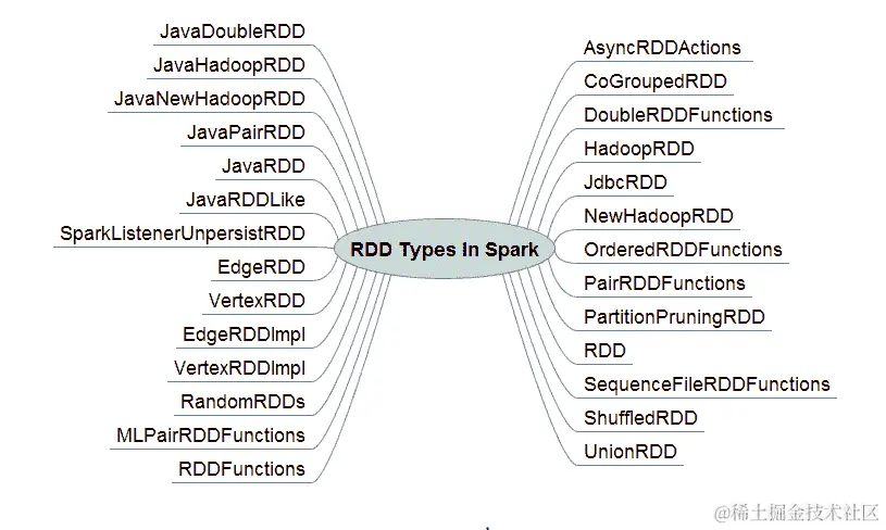 Spark 中有许多类型的 RDD 可以简化编程。下面的思维导图描述了 RDD 的部分分类。建议 Spark 上的程序员至少了解可用的 RDD 类型,甚至是不太知名的类型,如RandomRDD、VertexRDD、HadoopRDD、JdbcRDD和UnionRDD,以避免不必要的编码。