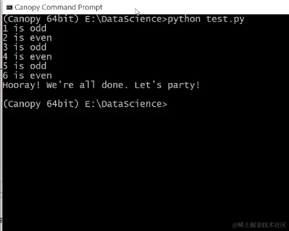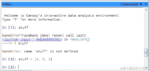 - 当您在 Canopy 编辑器窗口底部输入上述行时,屏幕会显示如下;当然不要忘记按回车键: