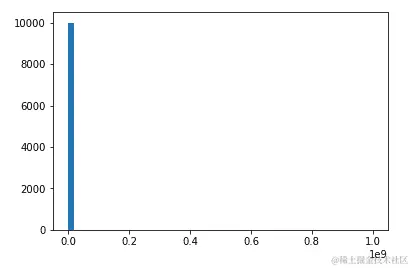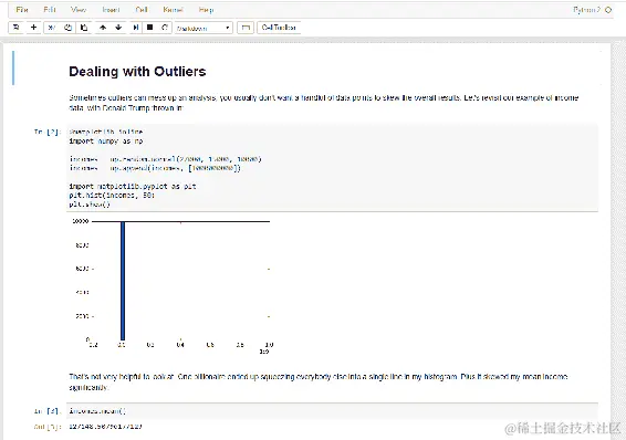 如果您选择包含此行的代码块,并点击运行按钮运行代码,您将在其下看到输出,由于异常值的影响,输出将是一个非常大的值,类似于这样: