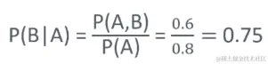 因此,给定通过第一个测试的情况下通过第二个测试的概率等于通过两个测试的概率 P(A,B)(我知道 60%的人通过了两个测试,而不考虑彼此的影响),除以通过第一个测试的概率 P(A),即 80%。计算结果是通过了两个测试的概率为 60%,通过了第一个测试的概率为 80%,因此给定通过第一个测试的情况下通过第二个测试的概率为 75%。