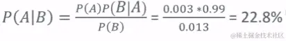 我们需要计算总体测试呈阳性的概率。我们可以通过计算用户测试呈阳性的概率和非用户测试呈阳性的概率的总和来计算出来。因此,在这个例子中,P(B)计算为 1.3%(0.990.003+0.010.997)。因此,我们有了 B 的概率,即在不了解您的其他情况下,总体上测试呈阳性的概率。