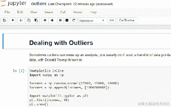 让我们在这里快速看一下这段代码。在这段代码中,我们设置了一些收入分布。我们模拟了人口中的收入分布,并且为了说明异常值对该分布的影响,我们模拟了唐纳德·特朗普加入并扰乱了收入分布的平均值。顺便说一句,我并不是在发表政治言论,这都是在特朗普成为政治人物之前完成的。所以,您知道,完全披露在这里。
